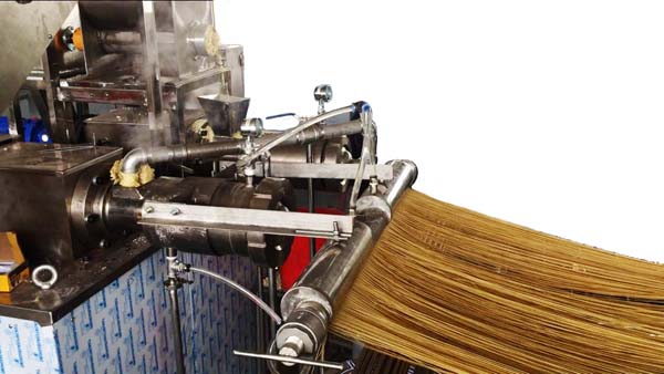 本生產(chǎn)線科學地解決了雜糧面雜糧含量較低的難題,實現(xiàn)了100%雜糧生產(chǎn)雜糧掛面冷面面條。本設備拓展了擠壓膨化理論,將擠壓設備和成型、預干燥、干燥設備有機的結合在一起,實現(xiàn)了在線調(diào)整生產(chǎn)工藝參數(shù),達到了工業(yè)化生產(chǎn)雜糧的目的。生產(chǎn)出的掛面產(chǎn)品口感滑爽、彈性好,同時保留了原料的風味和營養(yǎng)成份。