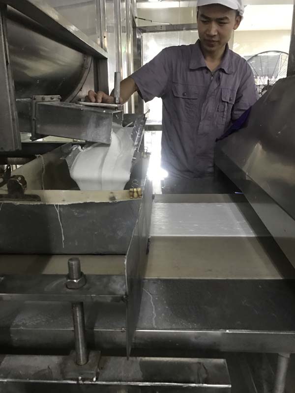 布好漿的網(wǎng)帶自動(dòng)進(jìn)入蒸粉機(jī),將米漿蒸熟成米粉片;