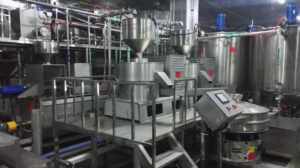 The mixing pot of this production line is equipped with a mixing device, which adjusts the rice pulp to a proper state with the cooperation of the quantitative powder feeder and prevents the rice pulp from settling. The slurry storage tank of the machine is equipped with level gauge and stirring device to ensure that the slurry does not precipitate and the slurry is evenly distributed.